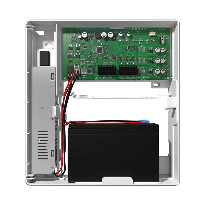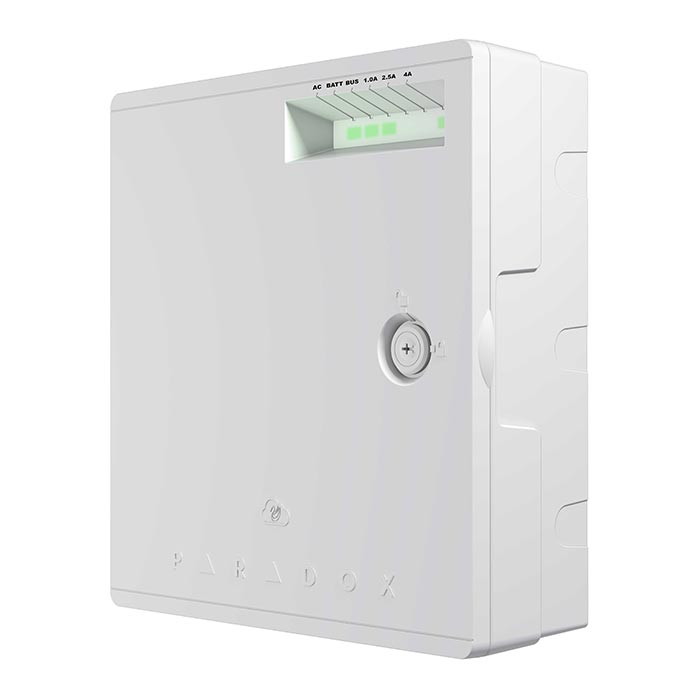 ماژول پاورساپلای PS45 دزدگیر شرکت پارادوکس کانادا PARADOX که توسط یک ترانس 16 ولت به برق شهری وصل می شود دارای سه خروجی 13.8 ولت DC می باشد . امکان اتصال باتری 12 ولت 4 امپر تا 14 امپر که باعث می شود تا در زمان قطعی برق ولتاژ قطع نشده و پاور ساپلای بتواند برق مورد نیاز سیستم اعلام سرقت را تامین کند .